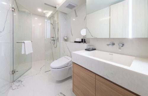 A fully equipped kitchenette includes a refrigerator, coffee/tea maker, microwave, stove, and dining table, alongside the convenience of an in-room washer. Stay connected with free high-speed Wi-Fi and enjoy entertainment on the 55-inch smart LCD TV. The bathroom is designed with a luxurious rain shower and a Japanese toilet.