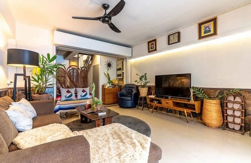 → Cozy, Asian-tropical design with living and dining areas.